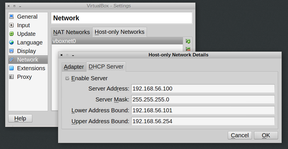 Within VirtualBox itself, both networks are set up. Choose File -> Preferences and go to Network. The tab NAT Networks does not list a network, but one is available anyways; no need to configure one. Change to tab Host-only Networks. Make sure that a network named vboxnet0 is availble. Click on the small screwdriver icon next to the list, and make sure that in the following popup, the Adapter and DHCP Server settings look as follows: